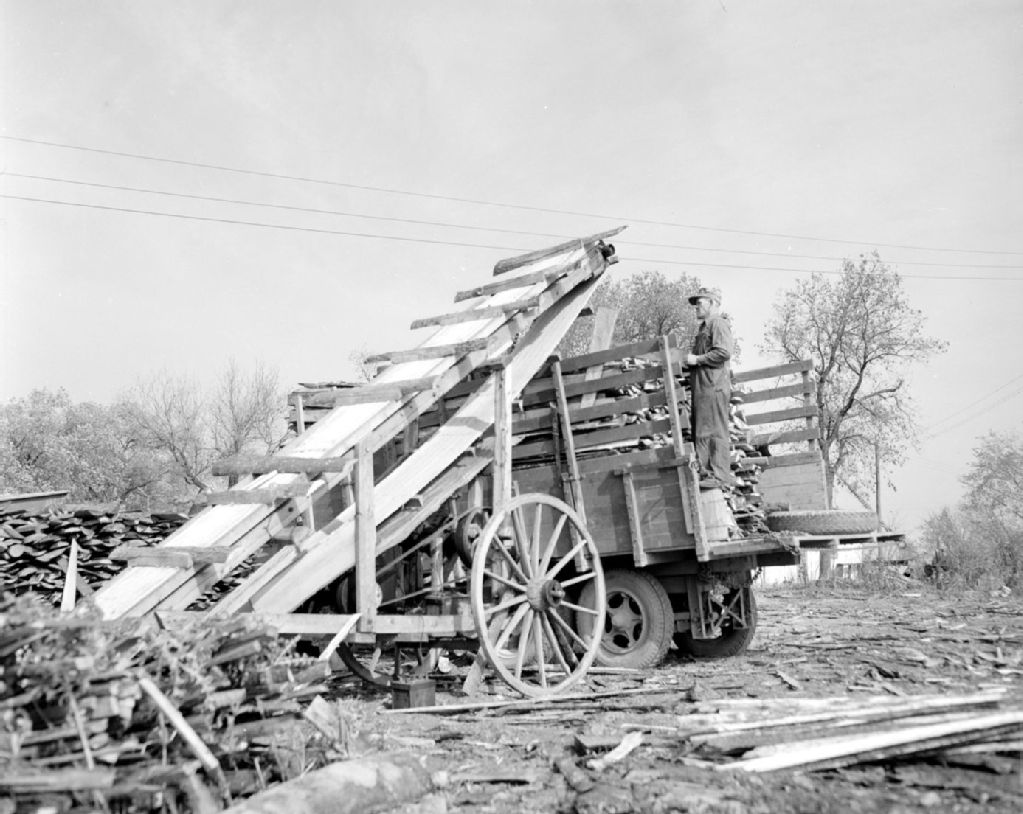 Chargement de bois sur un camion à L'Assomption, 1947, Archives nationales à Québec, Fonds Ministère de la Culture et des Communications, (03Q,E6,S7,SS1,D2,P60301), Omer Beaudoin.