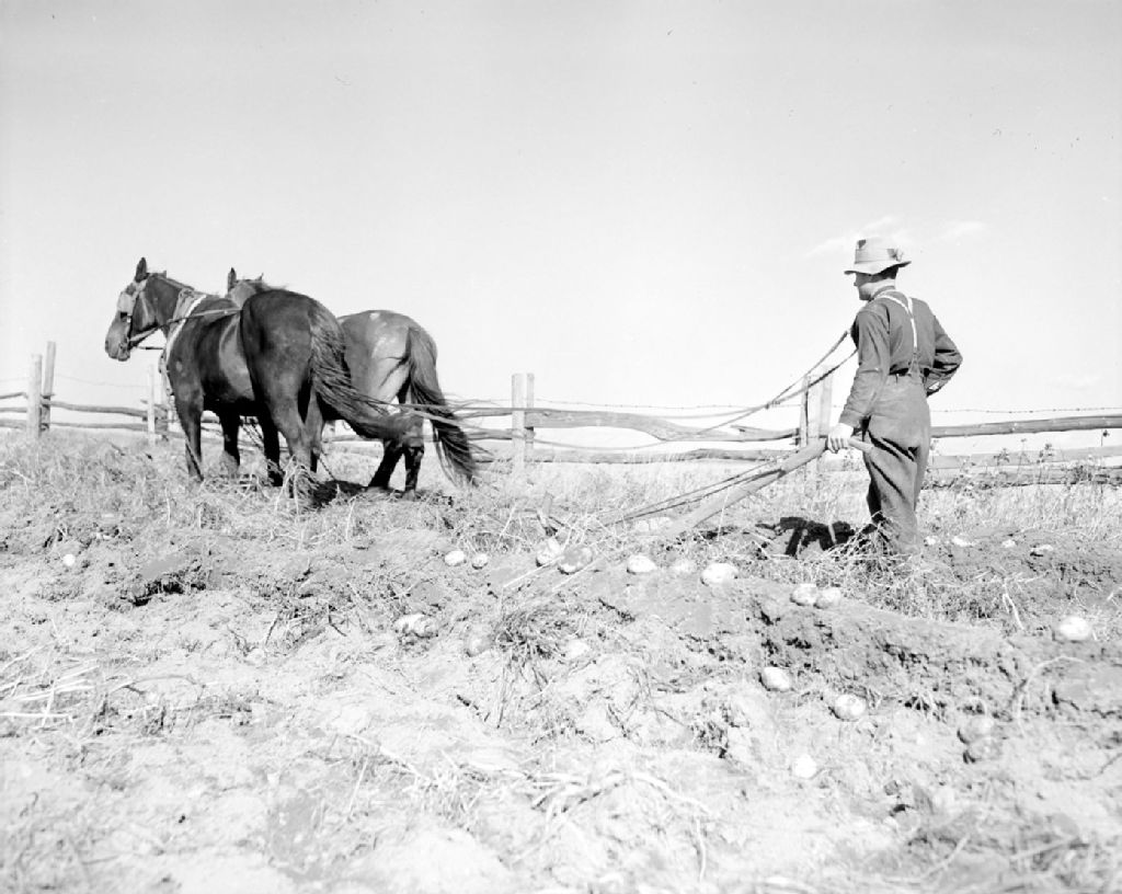 Récolte des pommes de terre à la charrue à Saint-Pierre, île d'Orléans, 1947, Archives nationales à Québec, Fonds Ministère de la Culture et des Communications, (03Q,E6,S7,SS1,D2,P60432), Omer Beaudoin.