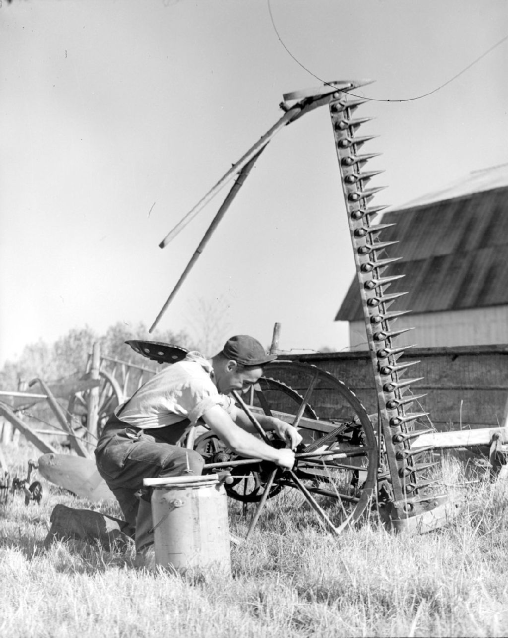 Graissage et réparation d'instruments aratoires à Saint-Pierre, île d'Orléans, 1947, Archives nationales à Québec, Fonds Ministère de la Culture et des Communications, (03Q,E6,S7,SS1,D2,P60439), Omer Beaudoin.