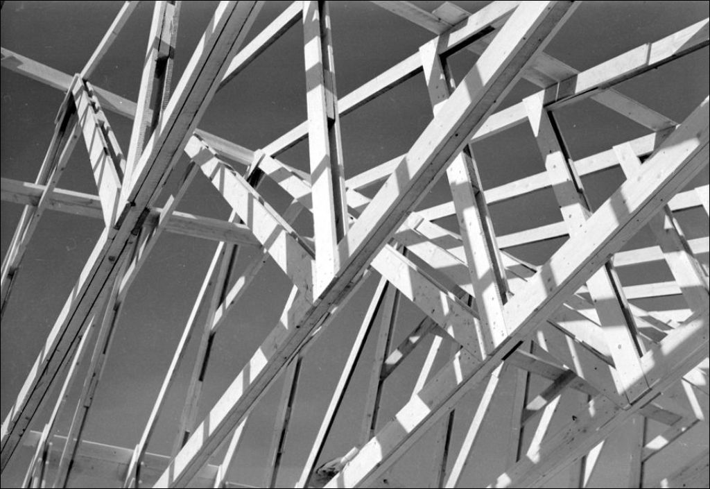 Construction de la scierie à Duchesnay: installation d'une ferme du toit, 1947, Archives nationales à Québec, Fonds Ministère de la Culture et des Communications, (03Q,E6,S7,SS1,D2,P60493), A. Linteau.