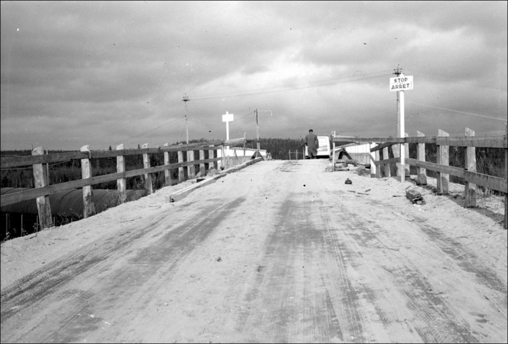 Viaduc au-dessus de la conduite de L'Ontario Paper à Ragueneau, comté de Saguenay, 1947, Archives nationales à Québec, Fonds Ministère de la Culture et des Communications, (03Q,E6,S7,SS1,D2,P60785), R. Savary.