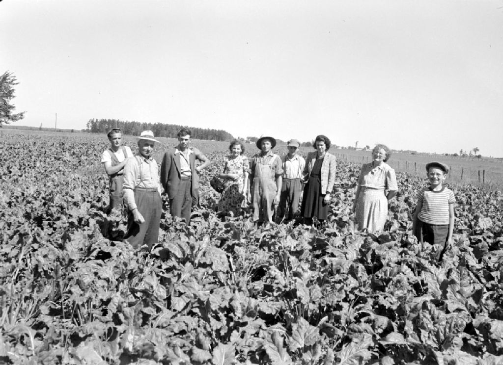 M. et Mme Lucien Blanchette avec leur famille dans un champ de betteraves à La Présentation, 1947, Archives nationales à Québec, Fonds Ministère de la Culture et des Communications, (03Q,E6,S7,SS1,D2,P60963), R. Lespérance.