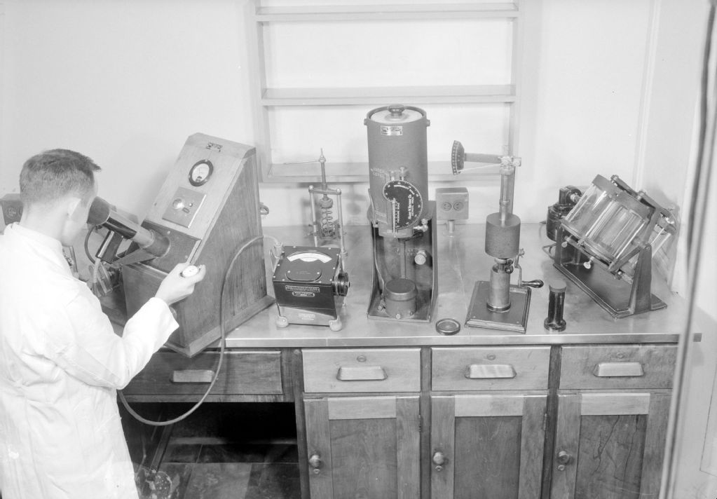 Laboratoire de minéralogie: appareil pour les essais sur les sables, 1947, Archives nationales à Québec, Fonds Ministère de la Culture et des Communications, (03Q,E6,S7,SS1,D2,P61141), Neuville Bazin.