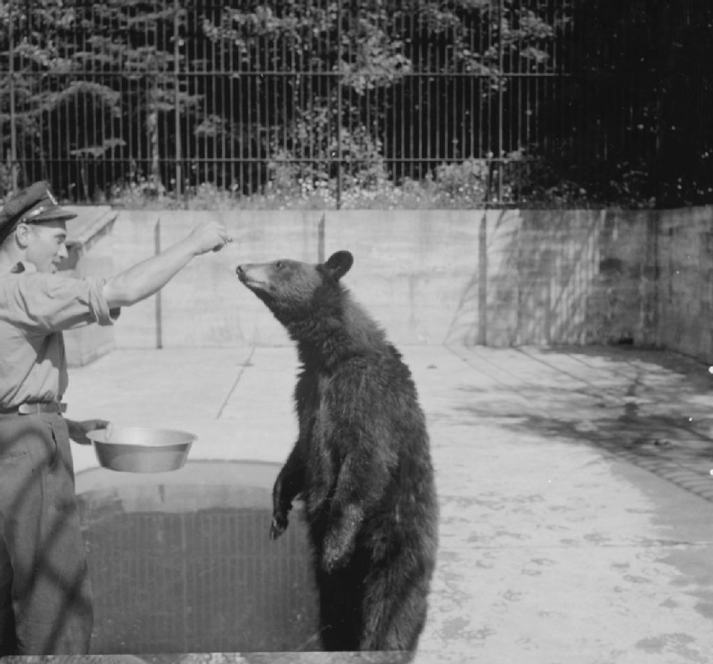 Ours noir mangeant dans la main du gardien au Jardin zoologique de Québec