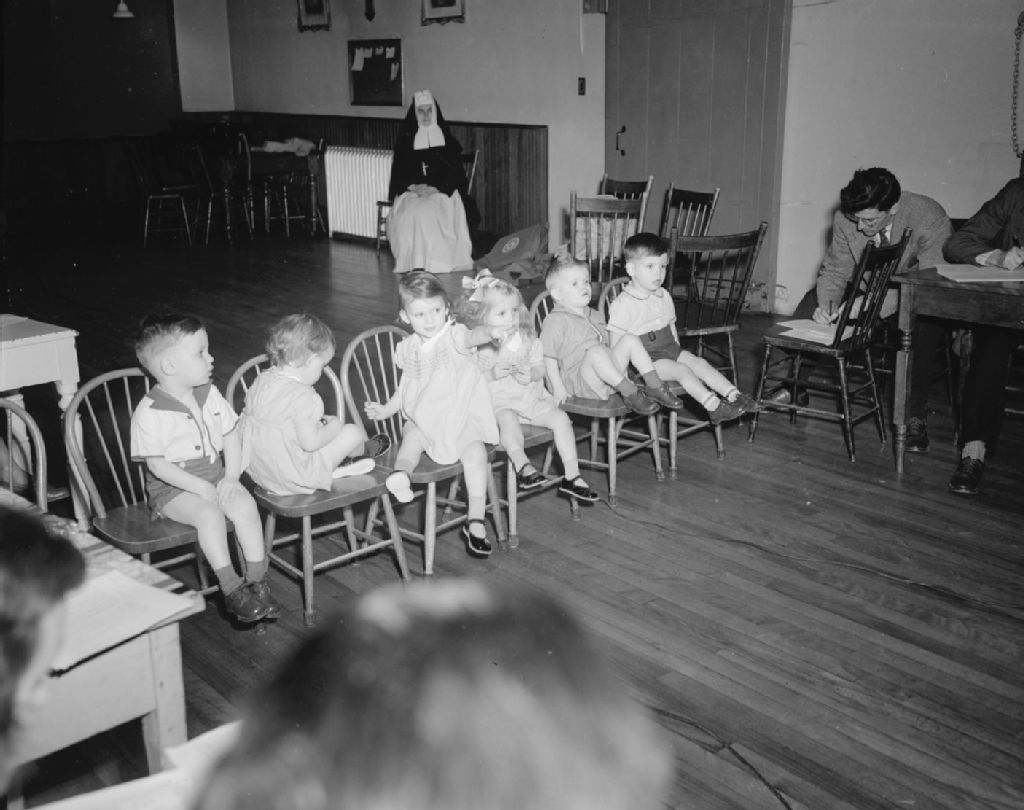 Tests physiologiques à la crèche dirigés par M. Pervy, 1948, Archives nationales à Québec, Fonds Ministère de la Culture et des Communications, (03Q,E6,S7,SS1,D2,P62199), Neuville Bazin.