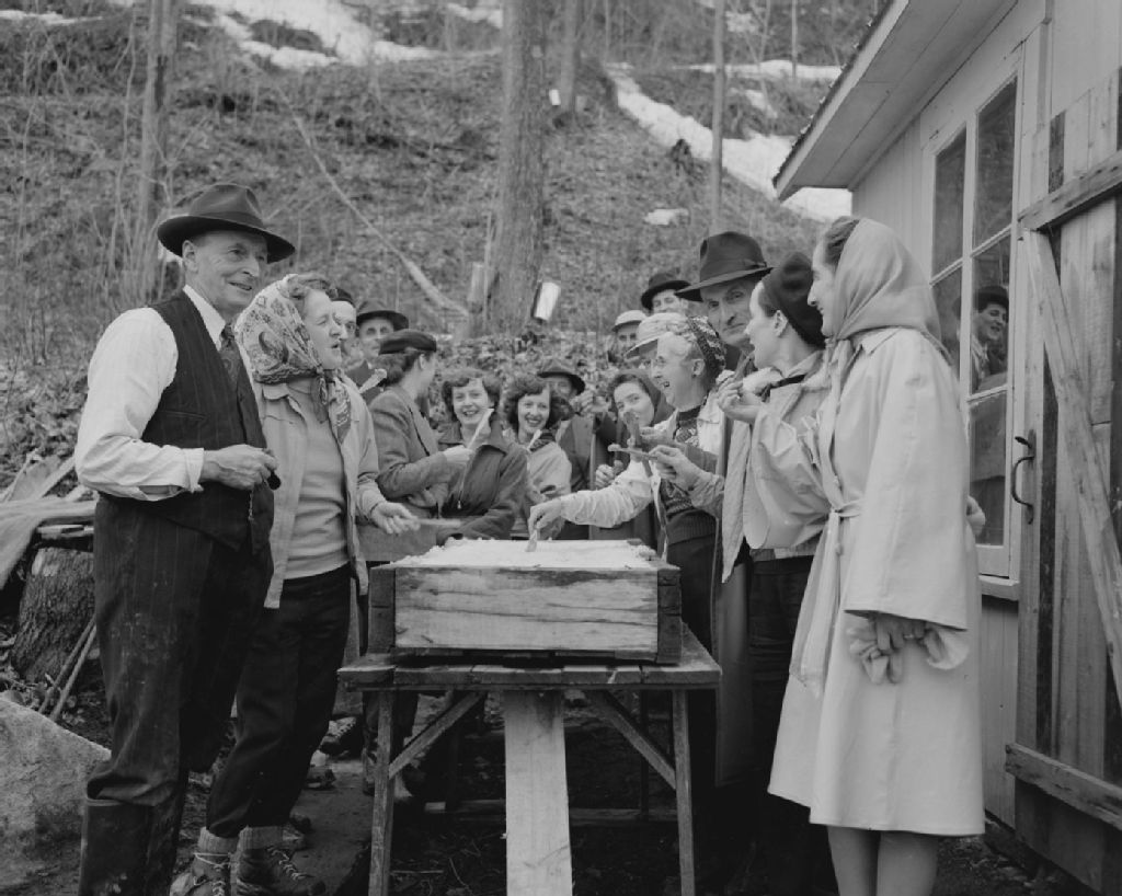 Un groupe dégustant de la tire d'érable, 1948, Archives nationales à Québec, Fonds Ministère de la Culture et des Communications, (03Q,E6,S7,SS1,D2,P62251), Omer Beaudoin.