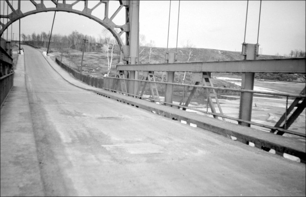 Pont suspendu sur la rivière Saint-Maurice à Grand-Mère, comté de Laviolette, 1948, Archives nationales à Québec, Fonds Ministère de la Culture et des Communications, (03Q,E6,S7,SS1,D2,P62406), T.M. Dechêne.