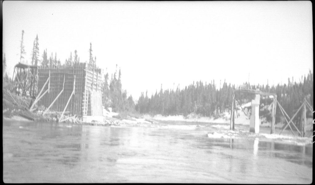 Coffre de la culée est, aprèes bétonnage, construction du pont sur la rivière aux Outardes à Ragueneau, Saguenay