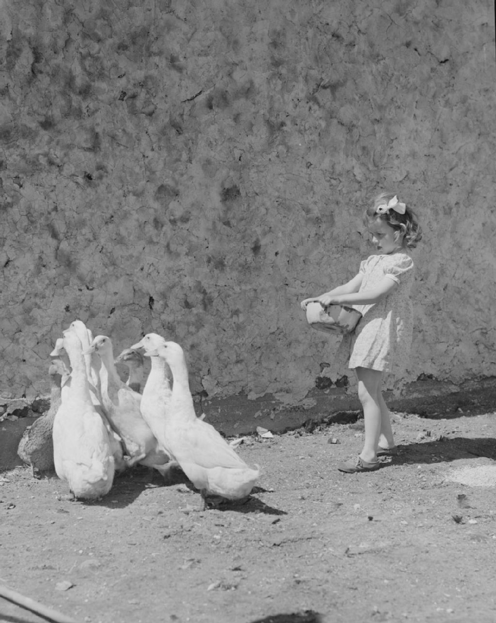 Fillettes soignant des canards à Saint-Alban, comté de Portneuf