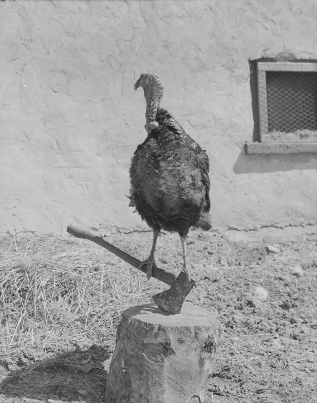 Dinde perchée sur une hache à Saint-Alban, comté de Portneuf