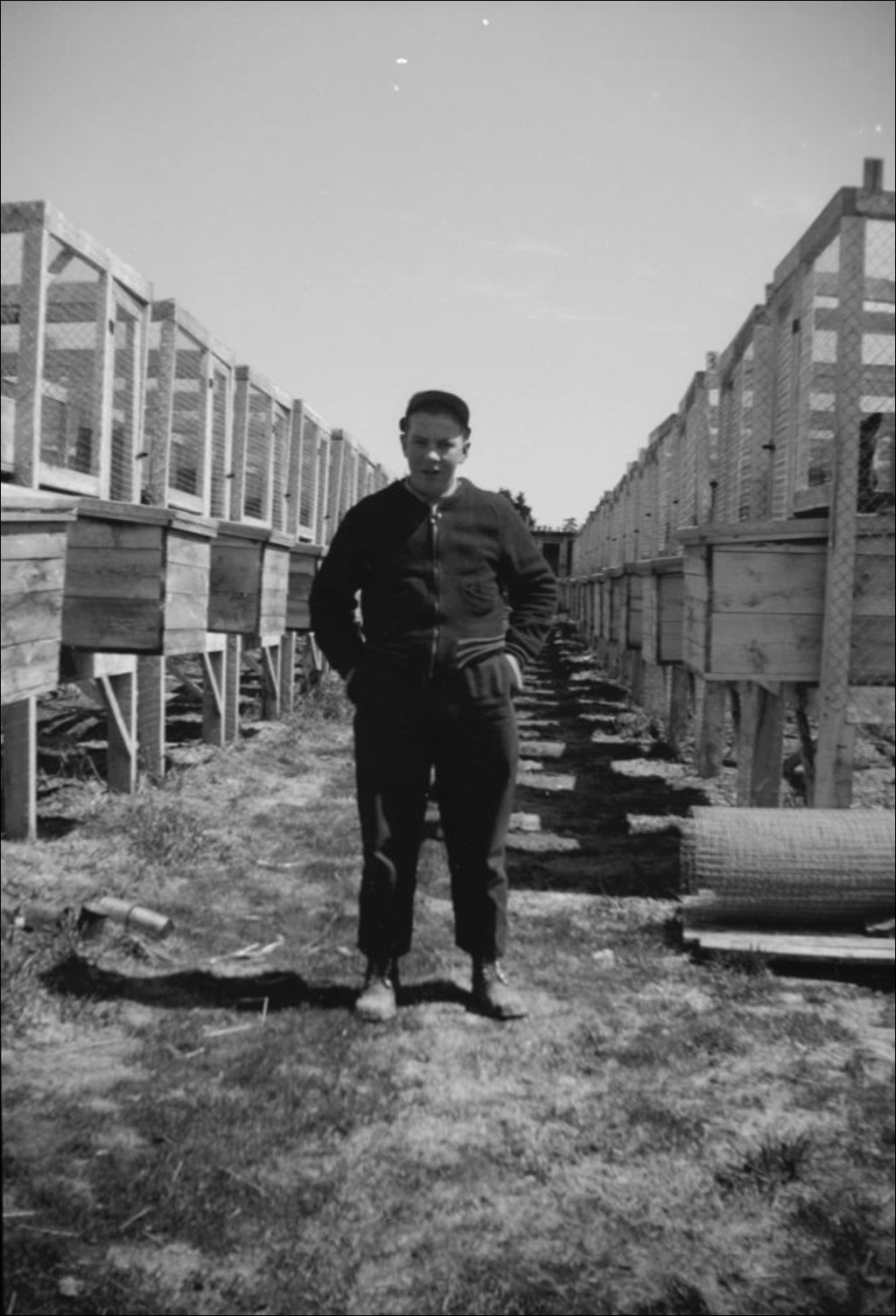M. Oscar Rioux dans sa renardière à Saint-Simon-de-Rimouski, 1948, Archives nationales à Québec, Fonds Ministère de la Culture et des Communications, (03Q,E6,S7,SS1,D2,P62630), J.B. Potvin.