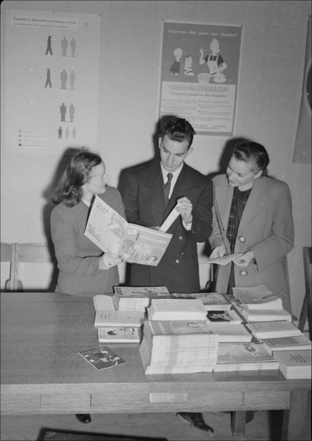 On examine des feuillets publicitaires nouvellement reçus de Québec à l'Unité sanitaire situé non loin de Saint-Odilon. Cap de la Madeleine, comté de Saint-Maurice
