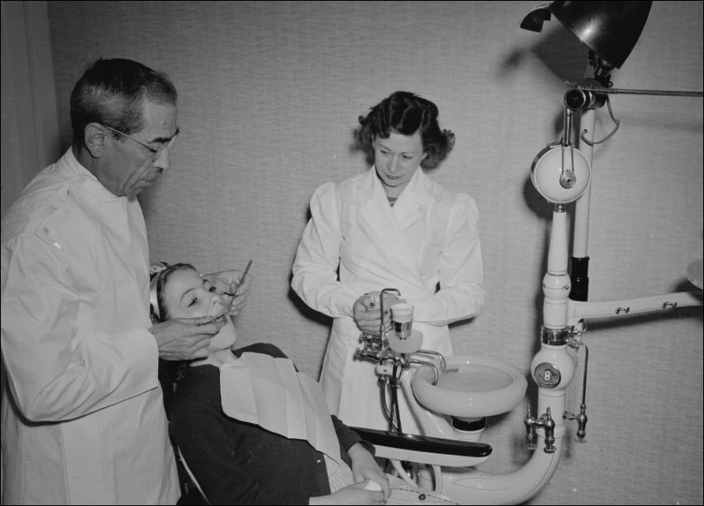 Un chirurgien dentiste fait partie du personnel régulier de l'Unité sanitaire de Trois-Rivières. Comté de Saint-Maurice, 1948, Archives nationales à Québec, Fonds Ministère de la Culture et des Communications, (03Q,E6,S7,SS1,D2,P62770), Paul Carpentier.