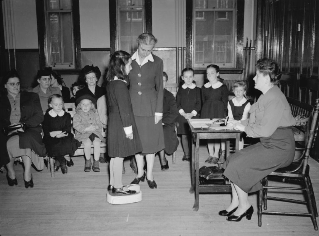 La vérification du poids des enfants par la clinique de l'Unité sanitaire de Trois-Rivières à l'école ménagère du Cap-de-la-Madeleine. Comté de Saint-Maurice