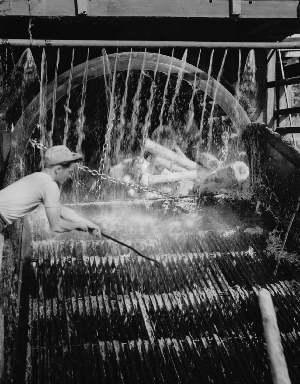 Écorçage de billes à l'usine de la Donnacona Paper Co. à Donnacona, 1948, Archives nationales à Québec, Fonds Ministère de la Culture et des Communications, (03Q,E6,S7,SS1,D2,P63086), J.W. Michaud.