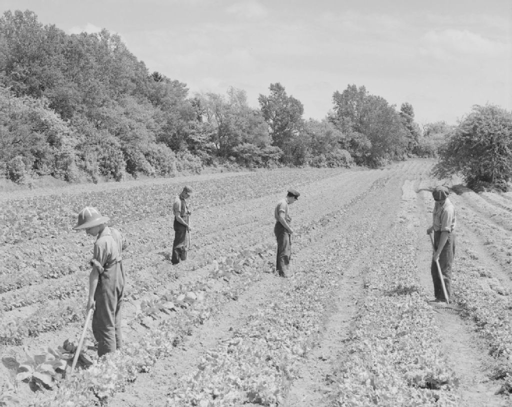 Des hommes travaillant dans un potager, 1948, Archives nationales à Québec, Fonds Ministère de la Culture et des Communications, (03Q,E6,S7,SS1,D2,P63310), Omer Beaudoin.