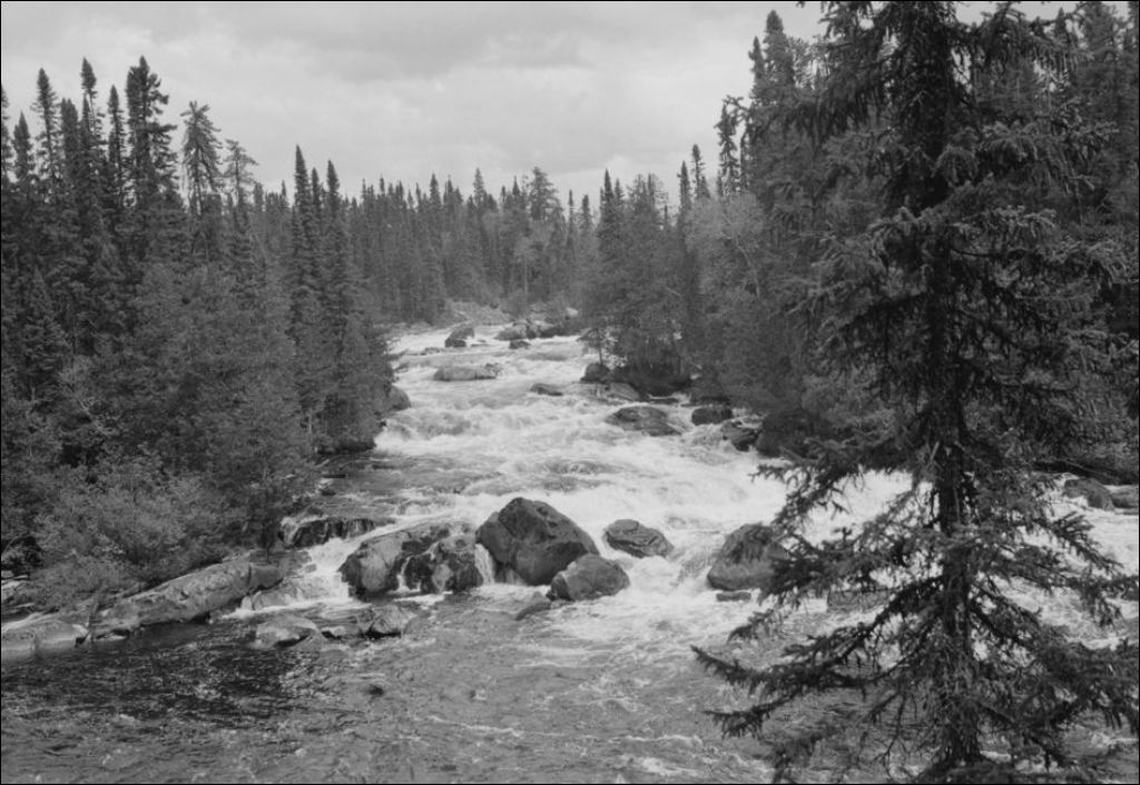 Chutes sur la Chibougamau, 1947, Archives nationales à Québec, Fonds Ministère de la Culture et des Communications, (03Q,E6,S7,SS1,D2,P63434), J.E. Gilbert.