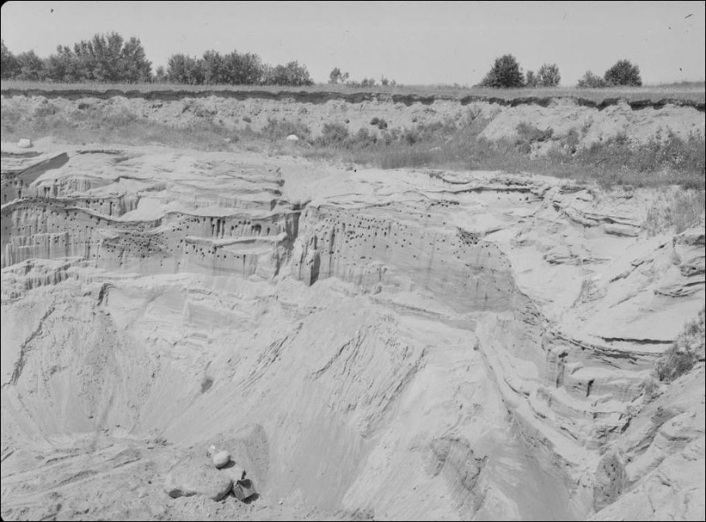 Hirondelle de rivage dans un trou à Beauport, 1948, Archives nationales à Québec, Fonds Ministère de la Culture et des Communications, (03Q,E6,S7,SS1,D2,P63620), Paul Carpentier.