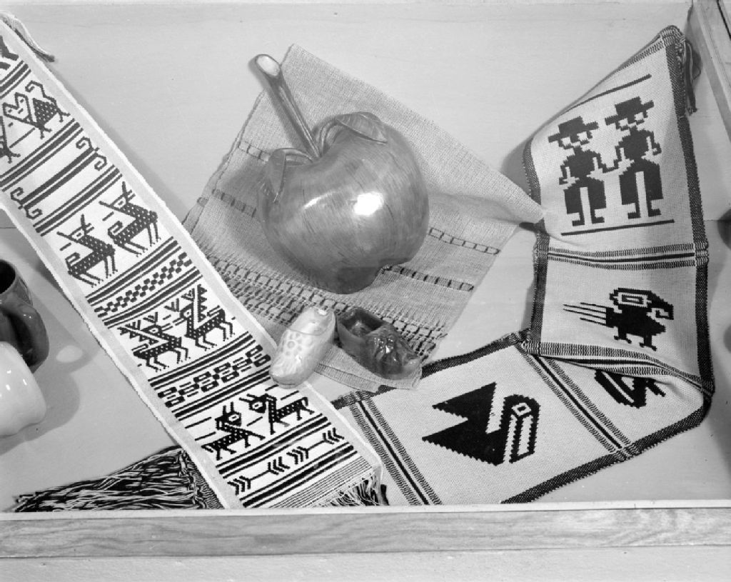 Exposition d'Arts Domestiques au Café du Parlement à Québec: pièces de tissage dans une vitrine