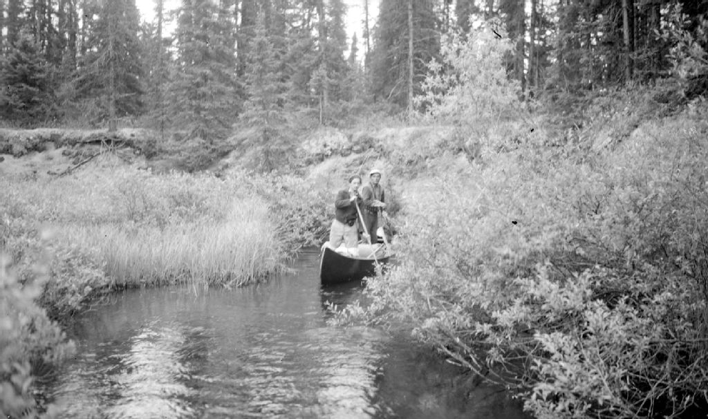 Tête de la rivière Chalifour située au nord est du lac du même nom. On peut voir à l'arrière-plan la plaine sableuse dans laquelle la rivière creuse son lit. Paul Grenier et Sam Gunner dans le canot