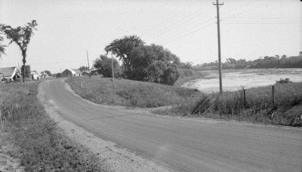 Vue prise à Saint-Hyacinthe-le-Confesseur sur la route Saint-Barnabé longeant la rive gauche de la rivière Yamaska, 1948, Archives nationales à Québec, Fonds Ministère de la Culture et des Communications, (03Q,E6,S7,SS1,D2,P64548), Benoit Brouillette.