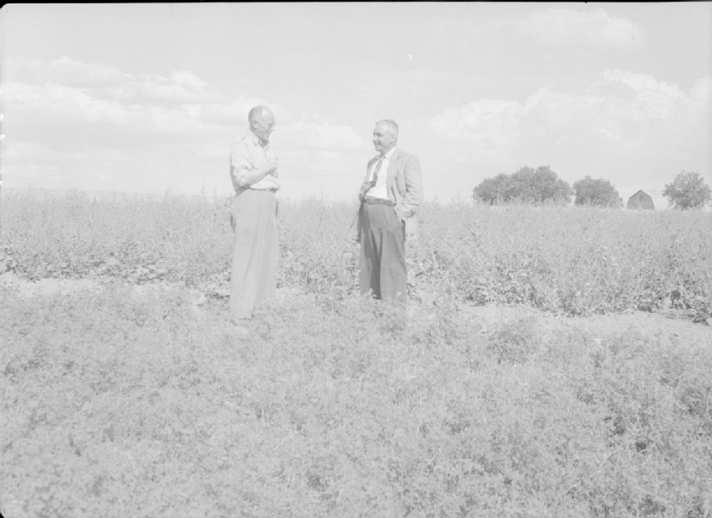 Production de graines de betterave à sucre à la ferme provinciale des semences, Lennoxville. À gauche: M. Émile A. Lods, professeur au collège Macdonald et administrateur de la ferme provinciale de semences; à droite: M. Louis Pasquier, gérant de la raffinerie de sucre de Saint-Hilaire