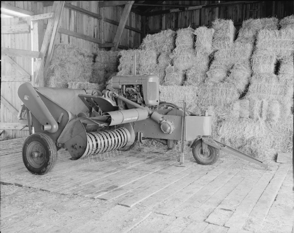La presse à foin dans la grange de Pierre Couture à Saint-Augustin, lauréat de la médaille d'or lors du mérite agricole de 1948