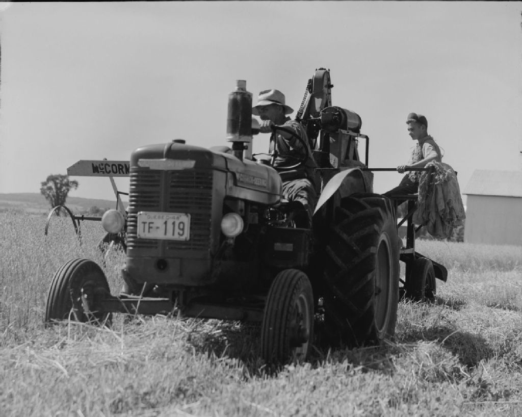 Pierre Couture sur sa moissonneuse à Saint-Augustin-de-Desmaures, 1948, Archives nationales à Québec, Fonds Ministère de la Culture et des Communications, (03Q,E6,S7,SS1,D2,P64732), Omer Beaudoin.
