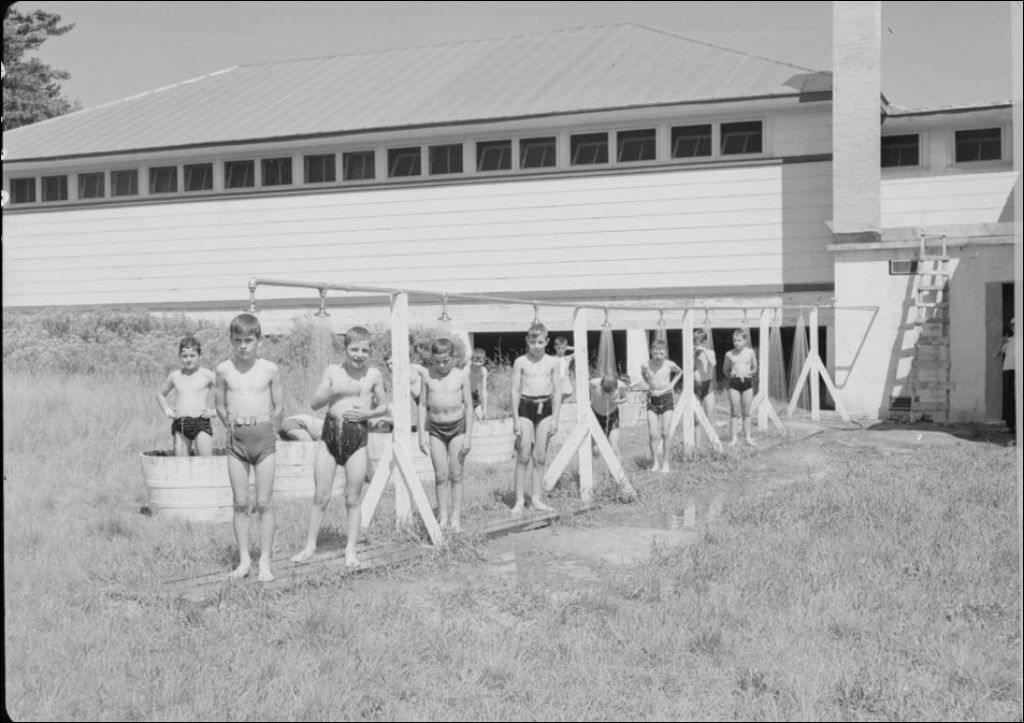 Enfants à la douche au Préventorium anti-tuberculeux de Cap-Rouge, 1948, Archives nationales à Québec, Fonds Ministère de la Culture et des Communications, (03Q,E6,S7,SS1,D2,P64753), Paul Carpentier.
