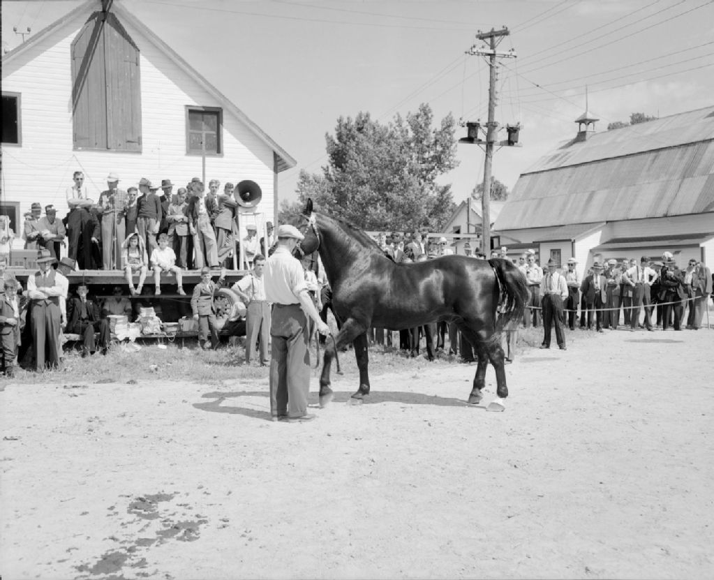 Démonstration de chevaux canadiens lors du pique-nique annuel des éleveurs à la ferme-école de La Gorgendière à Deschambault le 17 août 1948