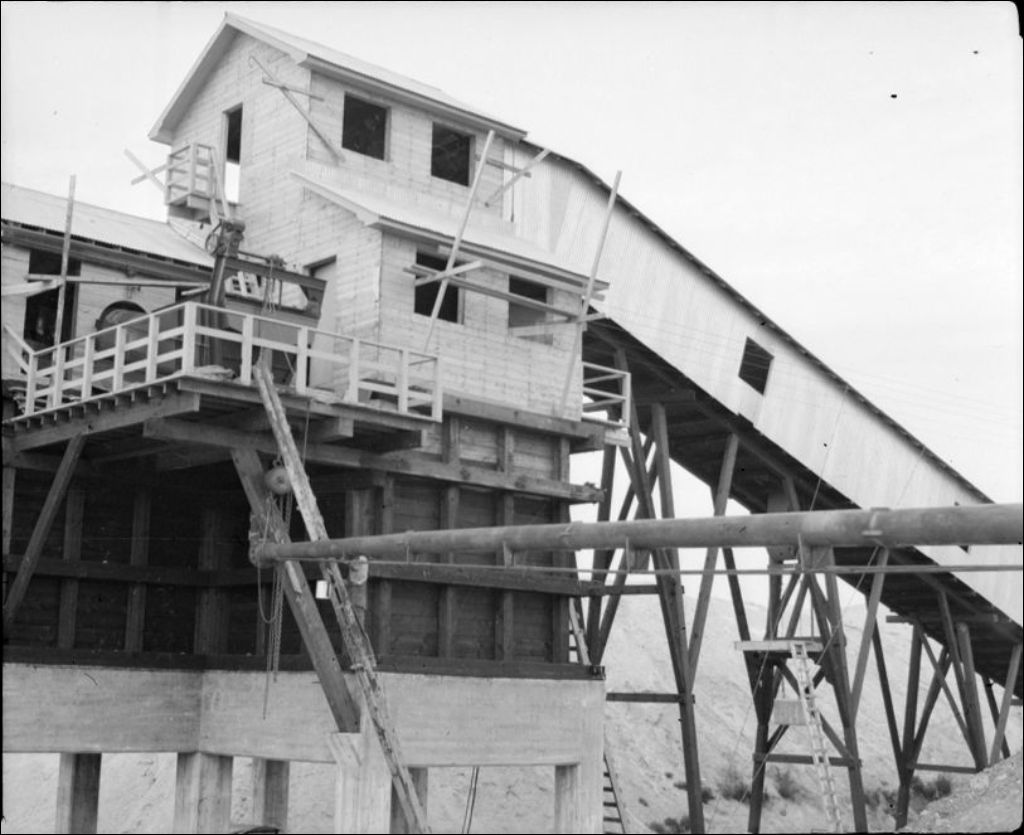 Atelier de lavage et de classification en construction de la mine de silice St-Lawrence Alloys & Metals Ltd à Melocheville, seigneurie de Beauharnois