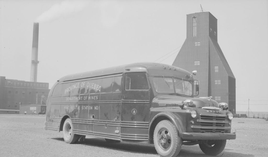 Le camion poste de secours pour les mines du ministère des mines de la province de Québec au Monarch G.M. Camp au lac Dasserat, Noranda