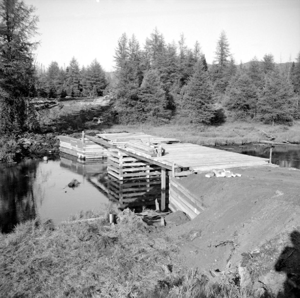 Construction d'un pont sur la rivière Montmorency dans le Parc national des Laurentides, 1948, Archives nationales à Québec, Fonds Ministère de la Culture et des Communications, (03Q,E6,S7,SS1,D2,P65346), Gustave Bédard.
