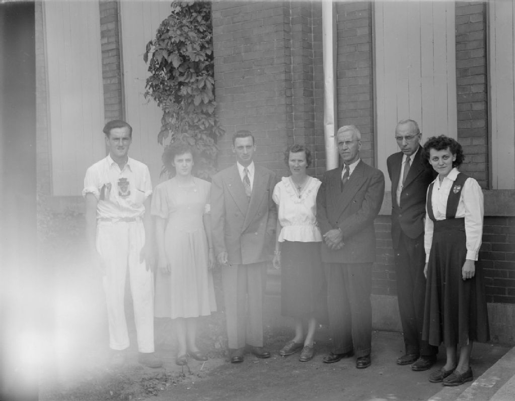 L'Honorable Laurent Barré, J. Simard et Mlle Gauvreau avec un groupe de jeunes lauréats à l'exposition provinciale de Québec, 1948, Archives nationales à Québec, Fonds Ministère de la Culture et des Communications, (03Q,E6,S7,SS1,D2,P65463), J. C. Magnan.