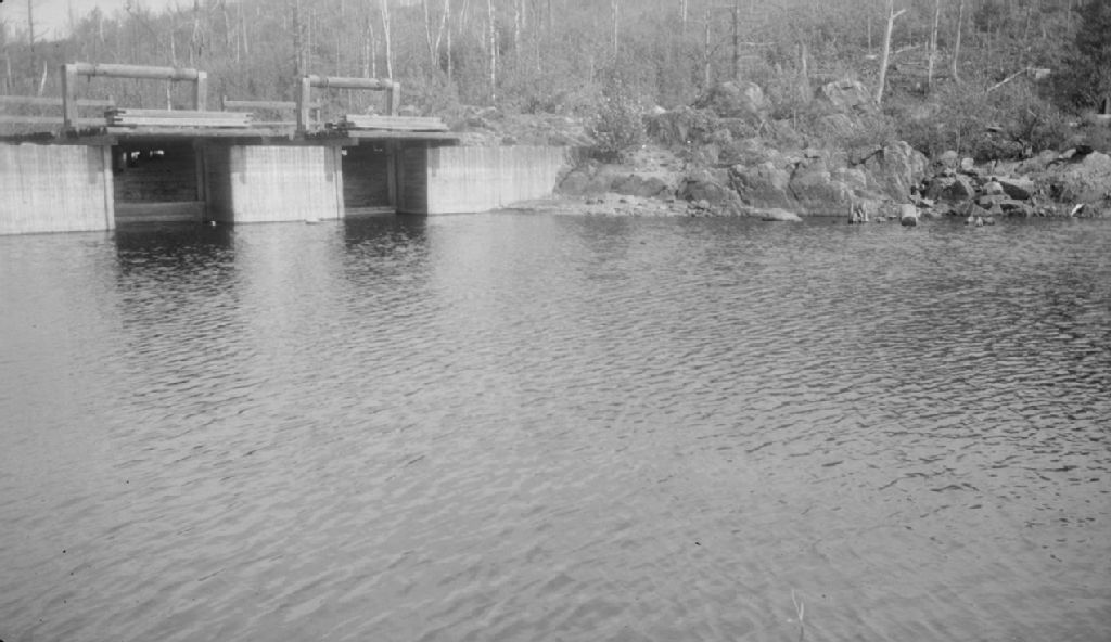 Barrage de la Consolidated Paper à l'issue du lac Ouareau. Saint-Donat, comté de Montcalm, 1948, Archives nationales à Québec, Fonds Ministère de la Culture et des Communications, (03Q,E6,S7,SS1,D2,P65705), Robert L. Ménard.