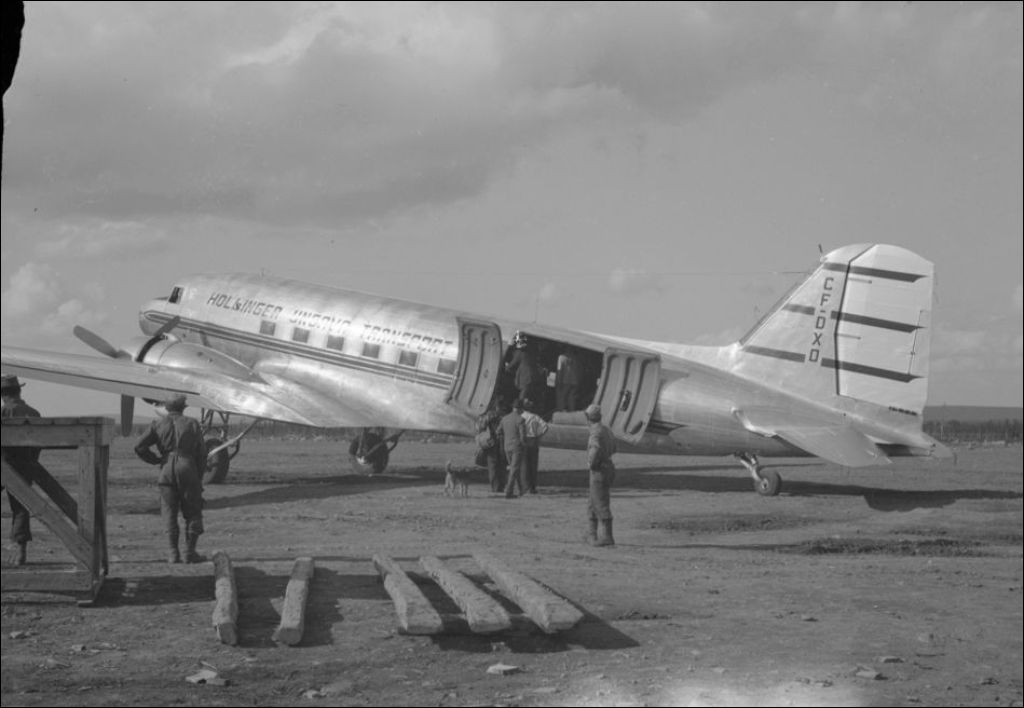 Transport plane at Knob lake landing stop. Hollinger North Shore Exploration Ltd. Ungava