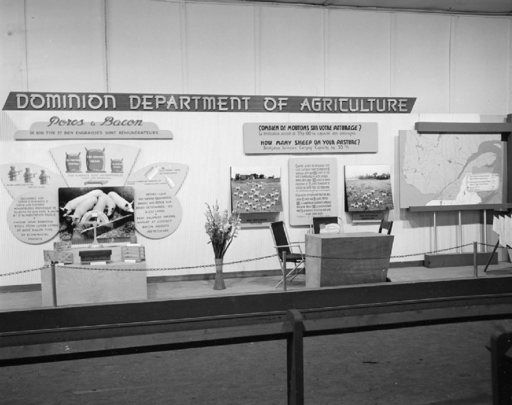 Le kiosque Fédéral "Porcs à bacon et pâturages" à l'exposition provinciale de Québec, 1948, Archives nationales à Québec, Fonds Ministère de la Culture et des Communications, (03Q,E6,S7,SS1,D2,P65821), Omer Beaudoin.