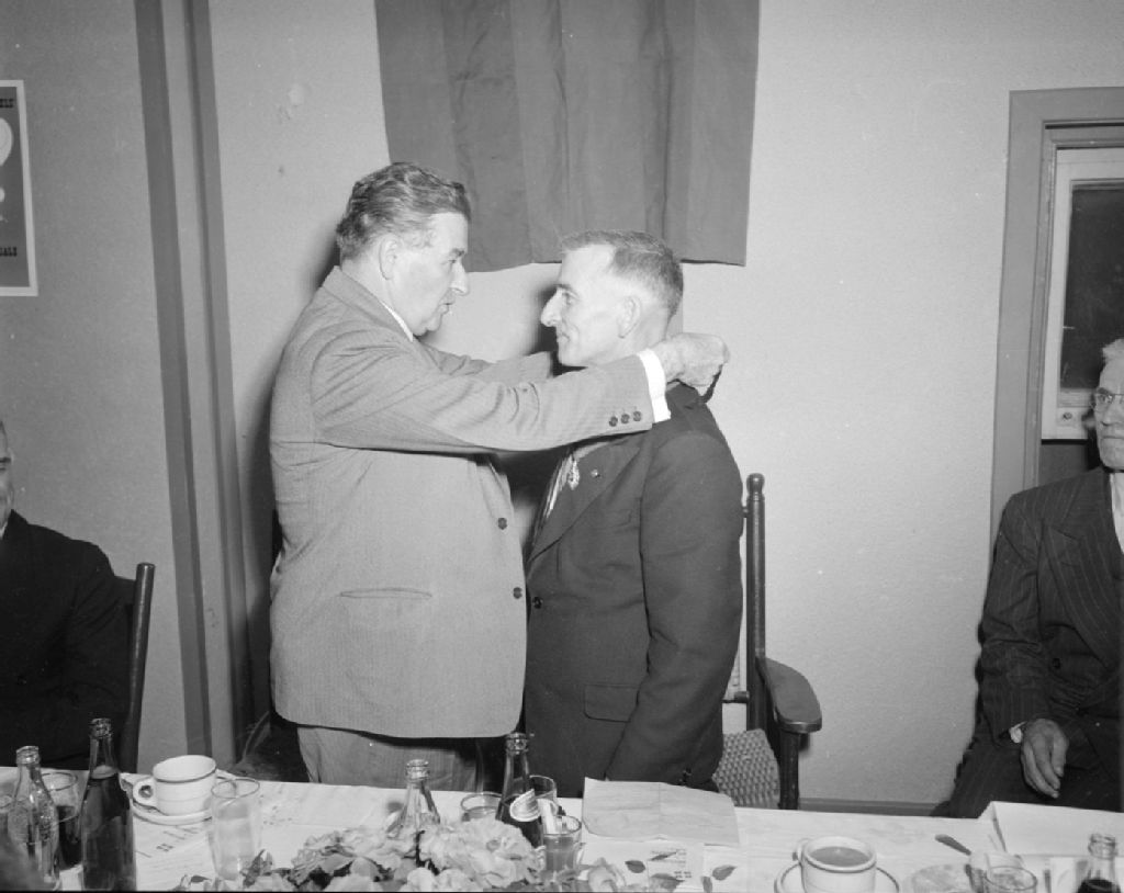 Maurice Duplessis remet une médaile à M. Pierre Couture, lauréat du Mérite agricole, au banquet de la fête du Mérite agricole à l'exposition provinciale de Québec, 1948, Archives nationales à Québec, Fonds Ministère de la Culture et des Communications, (03Q,E6,S7,SS1,D2,P65850), Omer Beaudoin.