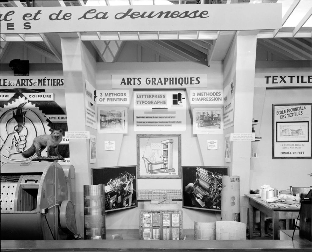 Kiosque sur la formation en arts graphiques du ministère du Bien-Être Social et de la Jeunesse à l'exposition provinciale de Québec