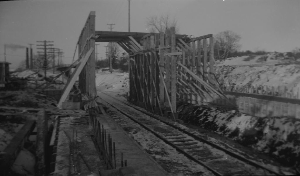Viaduc en béton armé à Saint-Télésphore au dessus des voies du C.N.R.. Érection de la fausse charpente. Saint-Télesphore, comté de Lévis, 1948, Archives nationales à Québec, Fonds Ministère de la Culture et des Communications, (03Q,E6,S7,SS1,D2,P66137), Jules Carbonneau.