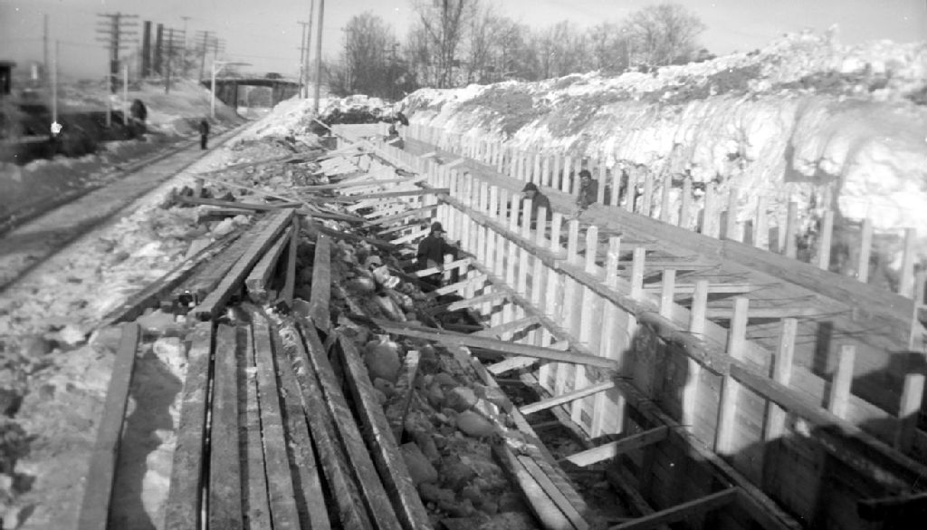 Viaduc au dessus des voies du C.N.R.. Coffrage de l'empattement du côté sud. Saint-Télesphore, comté de Lévis, 1948, Archives nationales à Québec, Fonds Ministère de la Culture et des Communications, (03Q,E6,S7,SS1,D2,P66145), Jules Carbonneau.