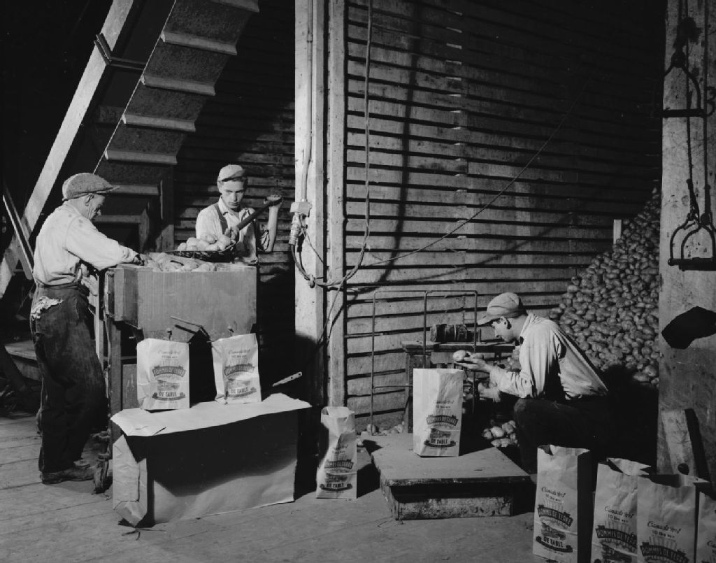 L'emballage à l'entrepôt du Syndicat des Producteurs de patates de Shipshaw. Chicoutimi, 1948, Archives nationales à Québec, Fonds Ministère de la Culture et des Communications, (03Q,E6,S7,SS1,D2,P66668), Omer Beaudoin.