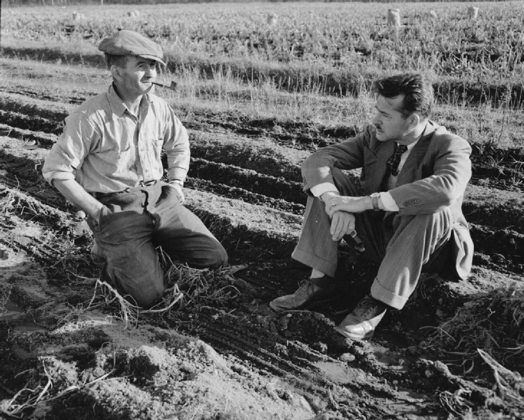 Monsieur Hidola Rochefort, aviseur technique du Syndicat des Producteurs de patates de Shipshaw causant avec le président, monsieur Aurèle Vachon. Saint-Ambroise de Chicoutimi