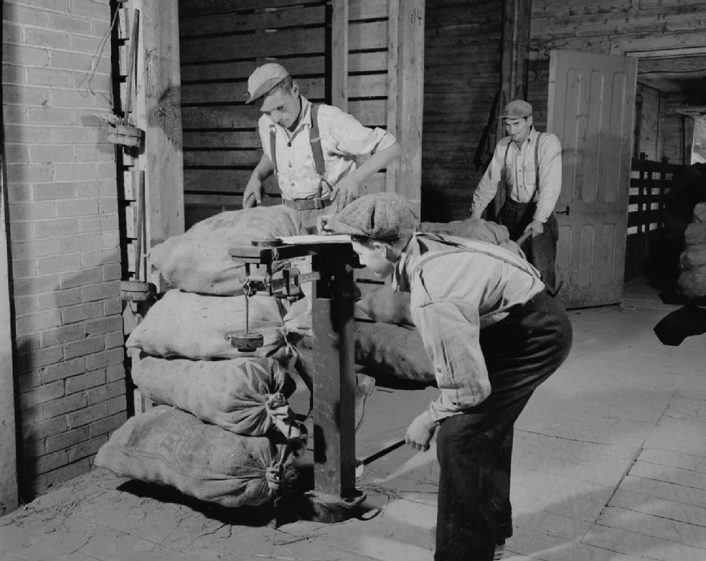 La pesée à l'entrepôt du Syndicat des Producteurs de patates de Shipshaw à Saint-Ambroise de Chicoutimi, 1948, Archives nationales à Québec, Fonds Ministère de la Culture et des Communications, (03Q,E6,S7,SS1,D2,P66671), Omer Beaudoin.