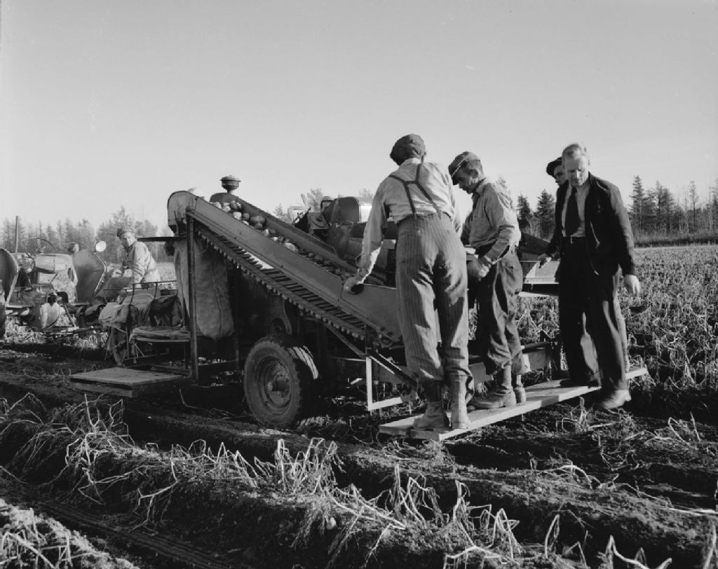 La récolte des pommes de terre au moyen d'une arracheuse de marque Bean chez monsieur Aurèle Vachon à Saint-Ambroise de Chicoutimi