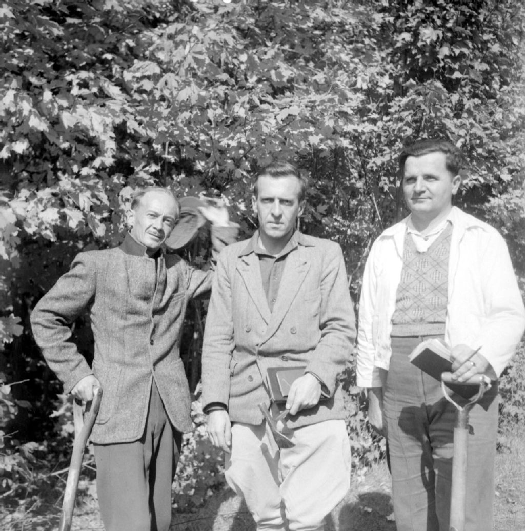 Monsieur Georges Aubert, pédologue français en expédition pédologique dans la province de Québec. De gauche à droite: M. Gérard Godbout, M. Georges Aubert, M. Ernest Pageau. Saint-Thomas, comté de Joliette, 1948, Archives nationales à Québec, Fonds Ministère de la Culture et des Communications, (03Q,E6,S7,SS1,D2,P66820), Auguste Mailloux.