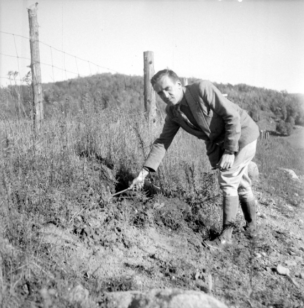 Monsieur Georges Aubert, pédologue français en expédition pédologique dans la province de Québec. Monsieur Aubert photographie et examine un paysage laurentien et un profil de sol brun. Sainte-Adèle, comté de Terrebonne