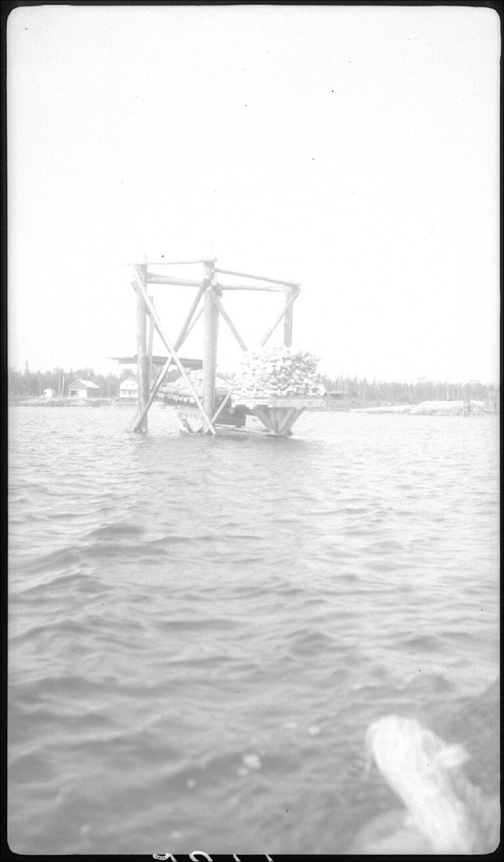Entretien des ponts: essai de pilotis dans le canton Dubuisson, Val-d'Or, 1942, Archives nationales à Québec, Fonds Ministère de la Culture et des Communications, (03Q,E6,S7,SS1,D2,P6695), J.M. Reid.