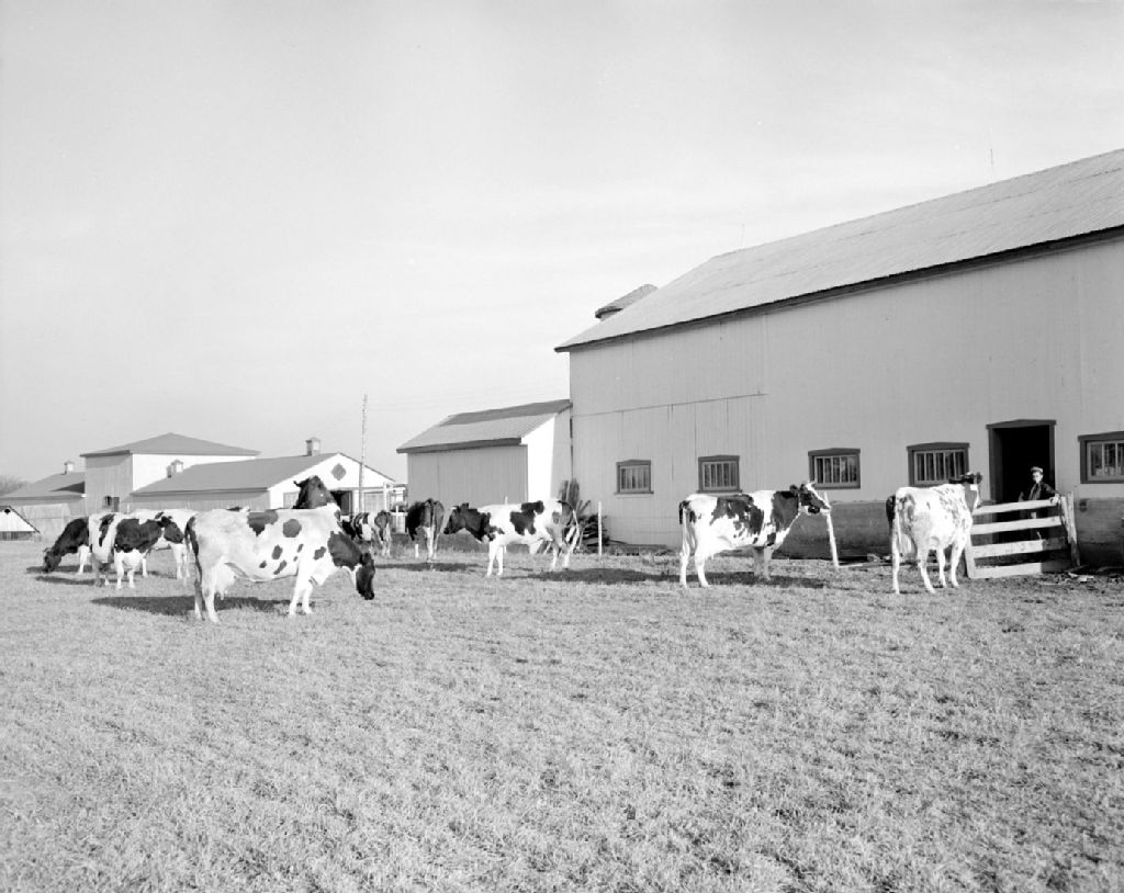 Partie du troupeau Holstein chez M. Eugène Bois à L'Ancienne-Lorette, 1948, Archives nationales à Québec, Fonds Ministère de la Culture et des Communications, (03Q,E6,S7,SS1,D2,P67135), Omer Beaudoin.