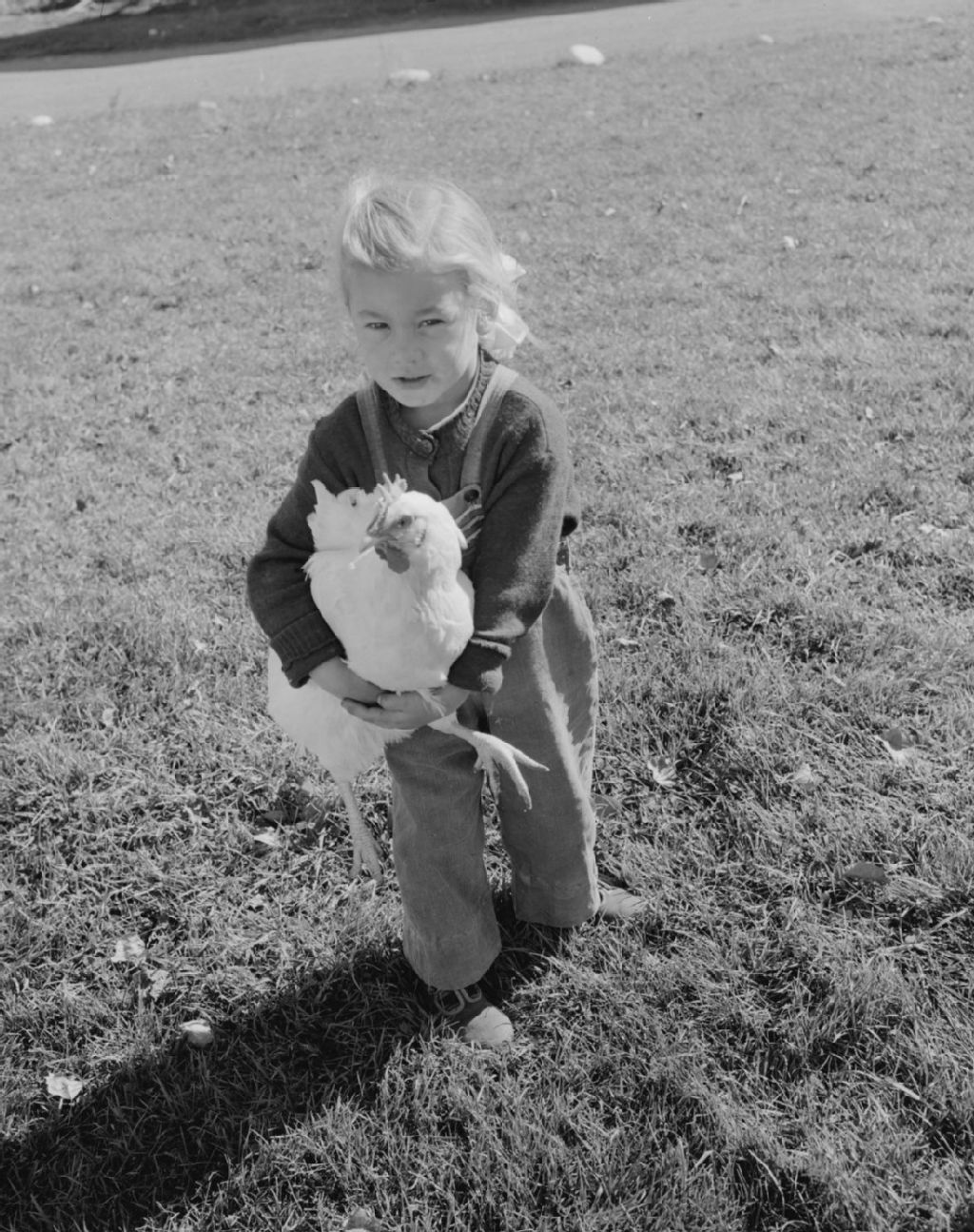 Lorraine, la fille de Henri Dupont, tenant une grosse poule à Saint-Étienne-des-Grès